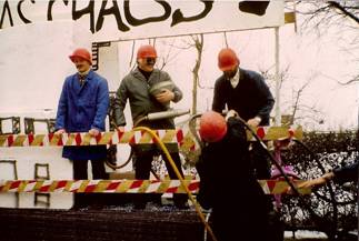 Der Applaus des Publikums machte einem ungläubigen Staunen platz bzw. schlug in Betroffenheit um, als unter lautem Getöse der Kompressor angeworfen und auf öffentlichen Straßen und Plätzen Löcher in das Pflaster gebohrt wurden. Das Erstaunen wuchs noch mehr, als die Fassade des Geschäfts unseres Sb. Franz Schäfer angebohrt wurde. Vollkommen unverständlich für Unbeteiligte war, dass wir für diese Leistung noch mit Grillkoteletts und Getränken bewirtet wurden.