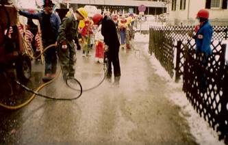 Es gehört nun schon fast zur Tradition, dass sich der Liederkranz am Umzug beim Kinderfasching, der heuer am 12.2.1983 stattfand und von Sb. Hans Frick jun. organisiert wurde, beteiligt. Als Thema der heurigen Präsentation wurde der Rankweiler Gemeindebauhof herangezogen, dessen Tätigkeit gebührend verulkt wurde. Der Zug bestand aus 2 Wagen, wobei der 1. Wagen das Thema „Planung“ darstellte. Auf dem 2. Wagen wurde mittels Styroporwürfeln gebaut und abgerissen und als Anhänger wurde ein Kompressor mit Presslufthammer mitgeführt. Die Wagen wurden von einigen Spezialisten in der Werkstätte Fink aufgebaut, den Kompressor besorgte Reinhard Preg und gezogen wurde das ganze Gespann mittels Traktor von Sb. Ernst Fink. Bevölkert, bzw. begleitet war die Kombination von zünftigen Technikern mit modernsten Instrumenten und von einigen gelungenen Typen von Gastarbeitern. Erstaunlich ist, wie wenig es braucht, um aus einen gestandenen Sänger einen echten Gastarbeiter zu machen.