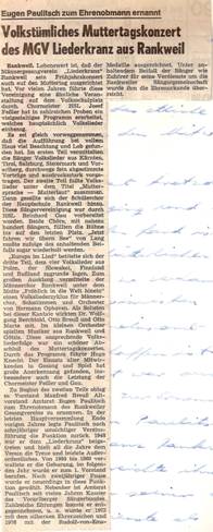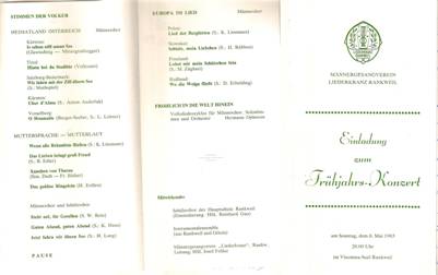Das diesjährige Frühjahrskonzert fand am 8.5.1983 d.h. am Muttertag im Vinomnasaal statt. Das Programm, das Chorleiter Josef Feßler zusammengestellt hatte, bestand größtenteils aus Volksliedern, als Abschluss folgte ein Volksliederzyklus für Männer, Solostimmen und Orchester unter dem Motto „Fröhlich in die Welt hinein“. Mitwirkende waren der Schülerchor der Hauptschule Rankweil, der uns bei einigen Darbietungen unterstützte sowie ein kleines Orchester das den Volkliederzyklus begleitete. Durch das Programm führte Sb. Hugo Knecht. Alles in allem ein Riesenprogramm, das etliche Zusatzproben bedingte und von den Mitwirkenden alles abverlangte.
