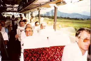 Um 12.00 Uhr mittags erreichten wir unser erstes Ziel, St. Gilgen am Wolfgangsee, wo wir im Gasthof Kendler das Mittagessen einnahmen. Nach einem kurzen Spaziergang durch den Ort bestiegen wir den 103 Jahre alten Raddampfer „Kaiser Franz Josef“ gerade zu dem Zeitpunkt, als es zu regnen begann und ein starker Wind aufkam. Der Aufenthalt an Deck wurde zu einem nassen Vergnügen, das nur durch die Beobachtung serienweise baden gehender Windsurfer aufgeheitert wurde und den größten Teil der Sänger veranlasste unter Deck zu gehen. Nach einer unfreiwilligen Ehrenrunde, bedingt durch Landeprobleme des alten Kahns, legten wir trotzdem unversehrt in St. Wolfgang an, wo wir auf kürzestem Weg das Hotel „Weißes Rössel“ aufsuchten. Die Bahnfahrt auf den Schafberg fiel natürlich dem widrigen Wetter zum Opfer, als Ersatz dafür machten wir, nachdem wir noch die Kirche mit ihrem wunderbaren geschnitzten Altar von Schwanthaler besichtigt hatten, eine Rundfahrt entlang den Salzkammergut-Seen. In einigen der engen Tunnels entlang der Straße am Attersee war die Reise fast zu Ende da wir nur nach mehrmaligen Reversieren und Einweisen das Tageslicht wieder erreichten. Um ca. 18.30 Uhr erreichten wir das Etappenziel des ersten Tages, Wels, wo wir unsere Zimmer beim „Neuwirt“ bzw. im „Grünauer Hof“ bezogen und im „Grünauer Hof“ das Abendessen serviert wurde. Der Abend vereinte dann alle Sänger im Heurigen-Lokal des Gasthofs „ Neuwirt“ wo sich die feucht-fröhliche Runde sichtlich wohl fühlte und ein langer Abend begann.