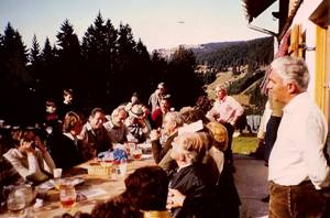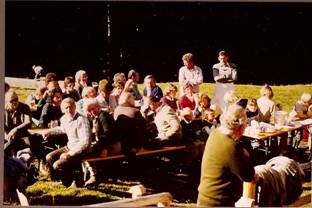 Am 26.10.1983 machten wir auf Einladung unseres Ehrenmitgliedes Adam Ölz einen Ausflug mit Kind und Kegel auf die Alpe „Untere Wüste“. Grund dazu war die Fertigstellung der neu erbauten Alp-Hütte anstelle der alten, die vor 2 Jahren abgebrannt war. Die Fahrt ging um 10.00 Uhr mit ca. 80 Personen in 2 Bussen ab Probelokal nach Bad Laterns und nach einer Fußwanderung von ca. 45 Minuten bei herrlichstem Herbstwetter erreichten wir den Bestimmungsort. Der Gastgeber hatte großzügigerweise auch für Verpflegung in Form von Bratwürsten und Bier gesorgt, der Wein wurde vom Tafelmeister Manfred Neyer gespendet, für Brot sorgte unser 2. Vorstand Werner Kopf, den Schnaps zur Regelung der Verdauung hatte Vorstand Manfred Breuß bereit gestellt und am Nachmittag zum Kaffee überraschte uns Sb. Otto Breuß mit Gebäck aus eigener Erzeugung. Zwischendurch begrüßte uns der Gastgeber und erzählte uns die Entstehungsgeschichte der wirklich zu längerem Verbleib einladenden gemütlichen Alphütte. Vorstand Manfred Breuß bedankte sich für die Einladung und überreichte Adam ein Bild mit der Vergrößerung eines Fotos das unserem Gastgeber zeigt wie er leibt und lebt. Trotz der schon fortgeschrittenen Jahreszeit spielten sich fast alle Aktivitäten im Freien ab, nur am Nachmittag, als es nach Sonnenuntergang etwas kühler wurde, sammelten sich die Gäste in der gemütlich ausgestatteten Hütte, um die gelungene Veranstaltung bei Unterhaltung und Gesang ausklingen zu lassen. Die Fahrt ab Bad Laterns erfolgte wieder mit Bus und ein kleiner Hock im Gasthof Mohren beendete diesen Ausflug der wieder einmal die gesamte Sängerfamilie vereinigte.