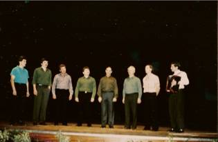 Ausnahmsweise fast vollständig, frisch gepflegt, und im Sängeranzug erschien die Sängerschar bei der Probe am 13.3.1990 zum Fototermin.