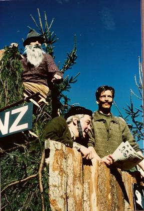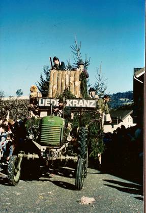 Bei frühlingshaftem, extrem warmen Wetter fand am 24.2.1990 der Umzug zum Kinderfasching statt, an dem auch wir mit einem Wagen unter dem Motto ‚Wald, Wild, Waid’, gezogen vom Traktor unseres SB Hans Frick jun., teilnahmen. So weit – so gut, anzumerken ist nur, dass sich unser Gefährt ca. 500m vor dem Ziel, im Bereich des Hotel ‚Freschen’, zum Erstaunen der Zuschauer selbst auflöste. Laut Aussage der planenden Architekten und Designer unter Leitung von SB Helmut Fink war dieses Phänomen als Rationalisierungsmaßnahme zum Abbruch zwar eingeplant, allerdings ergaben sich unvorhergesehene Timing – Probleme. Der Chronist schätzt sich glücklich, auf dem Hochstand Platz genommen zu haben, der wie ein Turm in der Brandung stehen blieb.